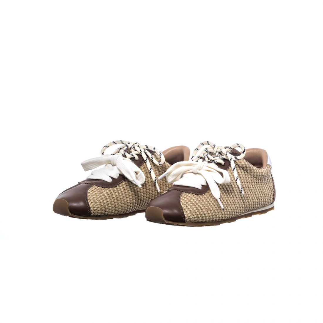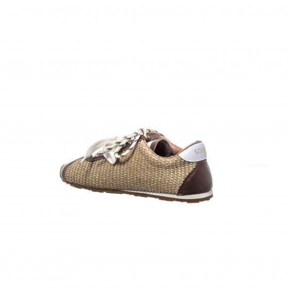 Sneaker en rafia taupe con detalles en piel tono marrón y cordones dobles. Fresca, ligera y sofisticada. El equilibrio perfecto entre estilo relajado y elegancia mediterránea.