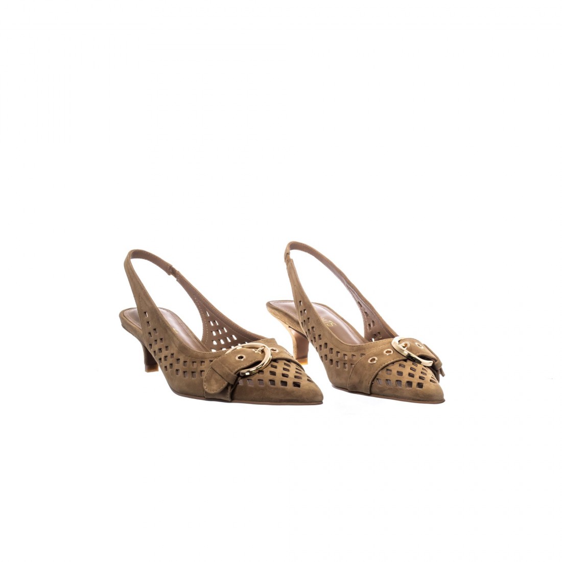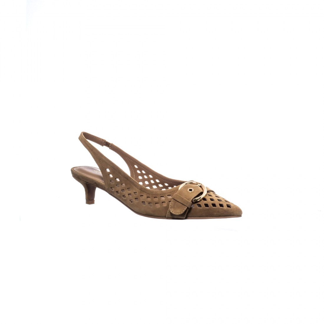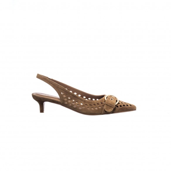 Slingback en ante tono cuero con calado geométrico y maxi hebilla dorada. Tacón medio estilizado para un equilibrio perfecto entre elegancia y confort.
