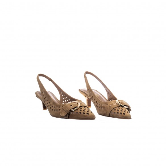 Slingback en ante tono cuero con delicado calado geométrico que aporta ligereza y frescura. Destaca su detalle frontal con maxi hebilla dorada que realza su carácter sofisticado. Tacón medio estilizado que equilibra altura y comodidad. Un diseño femenino y atemporal que eleva cualquier look con naturalidad.