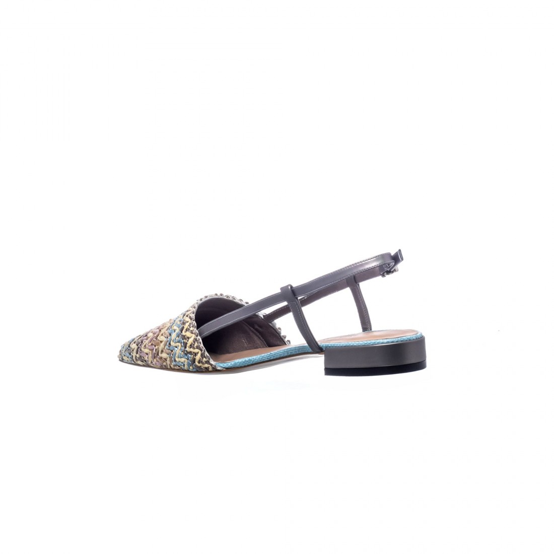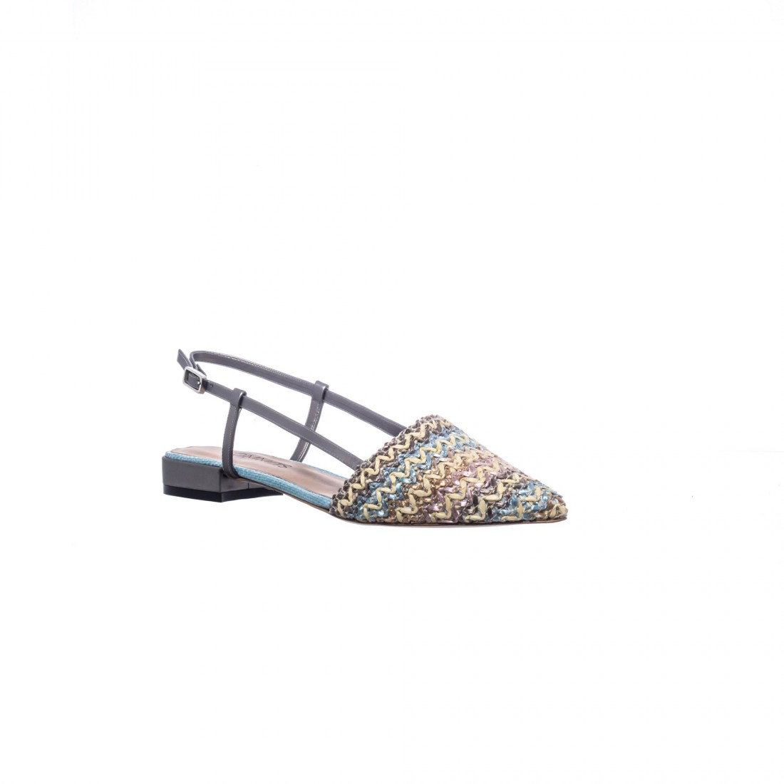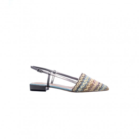 Bailarina destalonada confeccionada en rafia multicolor trenzada que aporta un carácter artesanal y un sutil juego de tonos. La silueta de punta fina estiliza el pie, mientras la tira trasera ajustable asegura un ajuste cómodo y ligero.