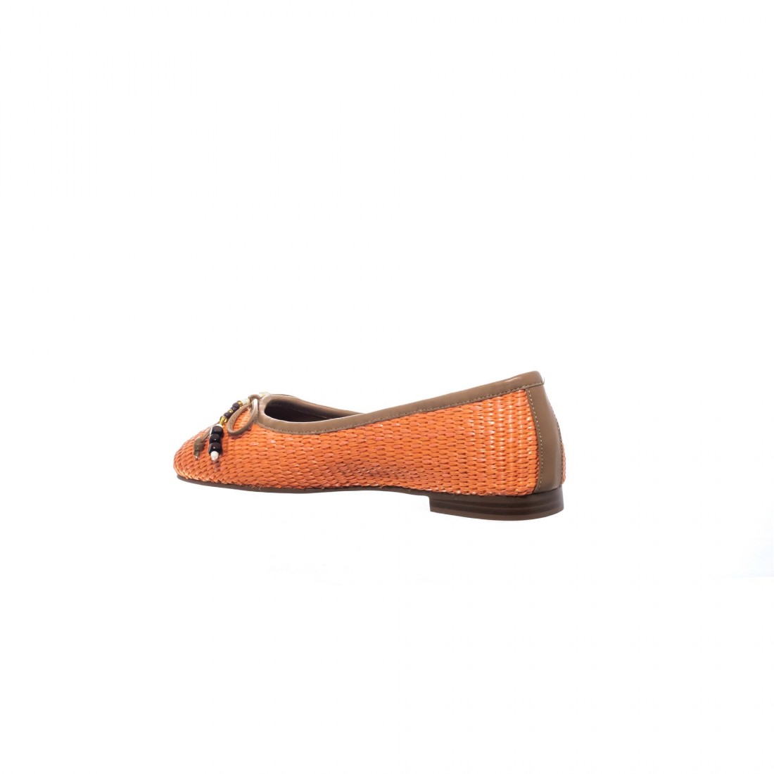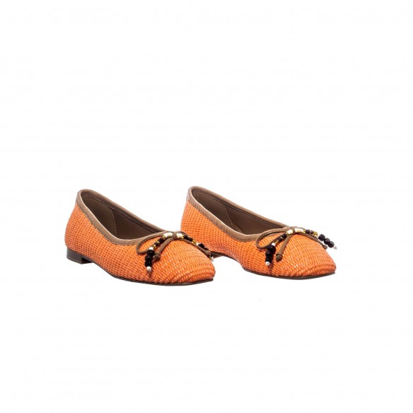 Bailarina artesanal en rafia color naranja, con ribete en piel y lazada decorativa con cuentas. Ligera, luminosa y perfecta para invitadas que buscan un toque mediterráneo vibrante.