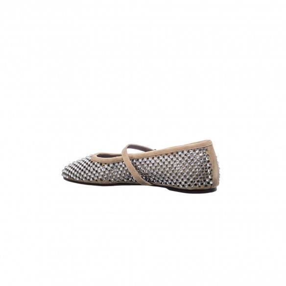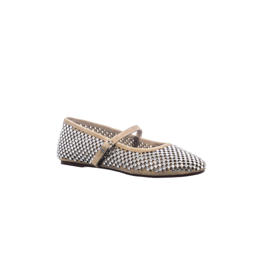 Bailarina estilo Mary Jane confeccionada en ante color sand, decorada con delicadas aplicaciones de strass que aportan luz y sofisticación con un efecto sutil y elegante. El tono neutro resalta el brillo de los detalles, creando una pieza femenina y muy versátil.
