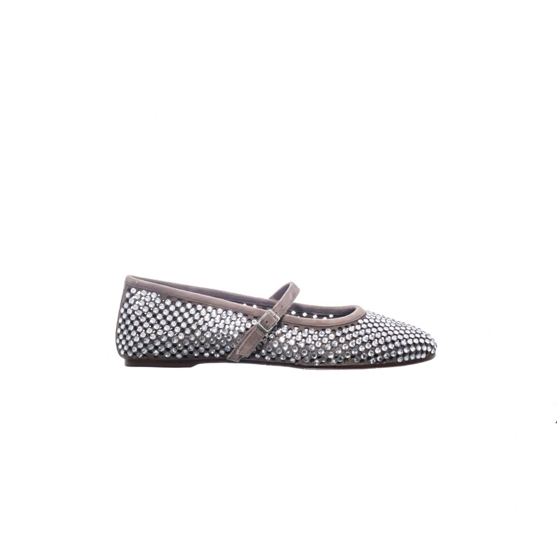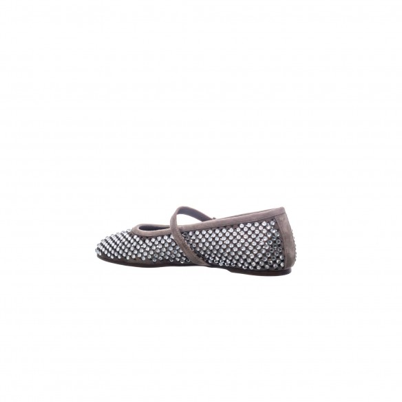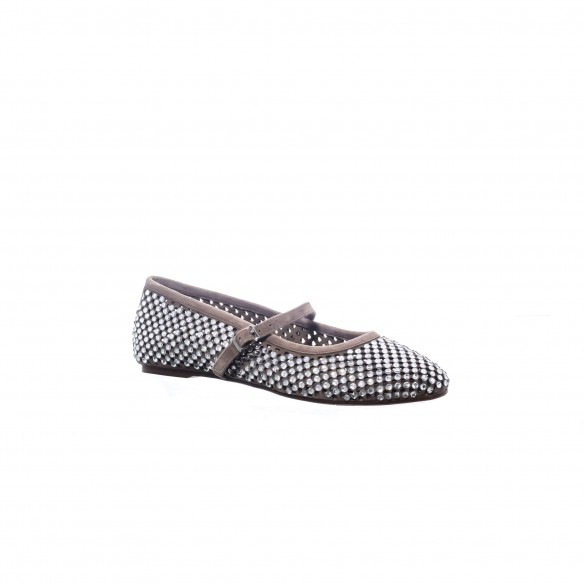 Bailarina estilo Mary Jane confeccionada en ante color taupe, decorada con delicadas aplicaciones de strass que aportan un brillo elegante y discreto. El tono taupe, neutro y sofisticado, potencia la luminosidad del strass creando un equilibrio armonioso entre sobriedad y feminidad.
