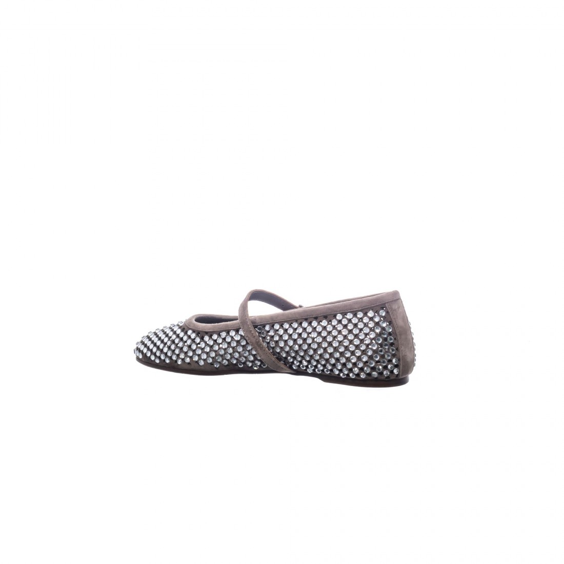 Bailarina tipo Mary Jane en ante color taupe con aplicación de strass. Un diseño elegante y versátil que combina brillo sutil y comodidad, perfecto para aportar un toque sofisticado tanto de día como de noche.