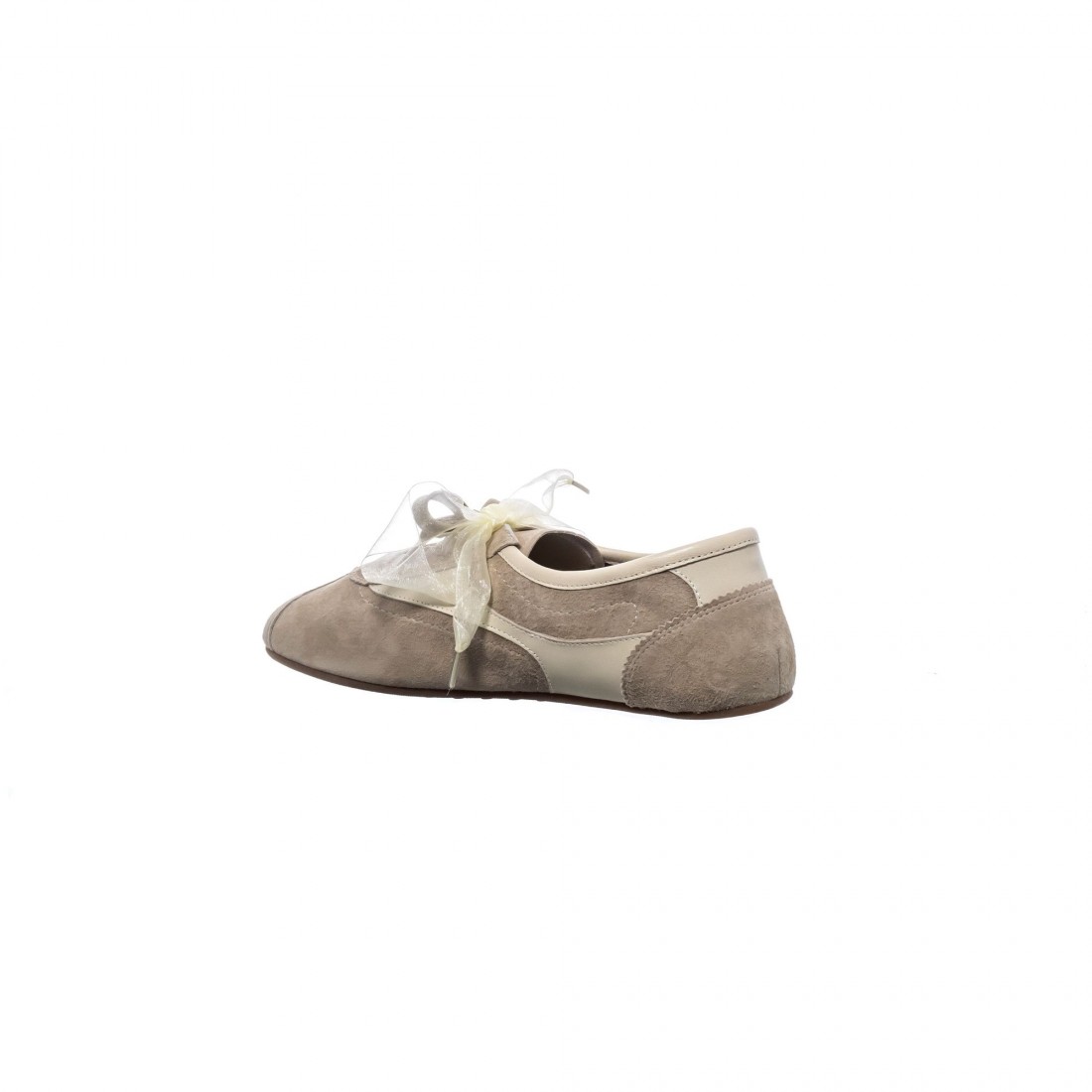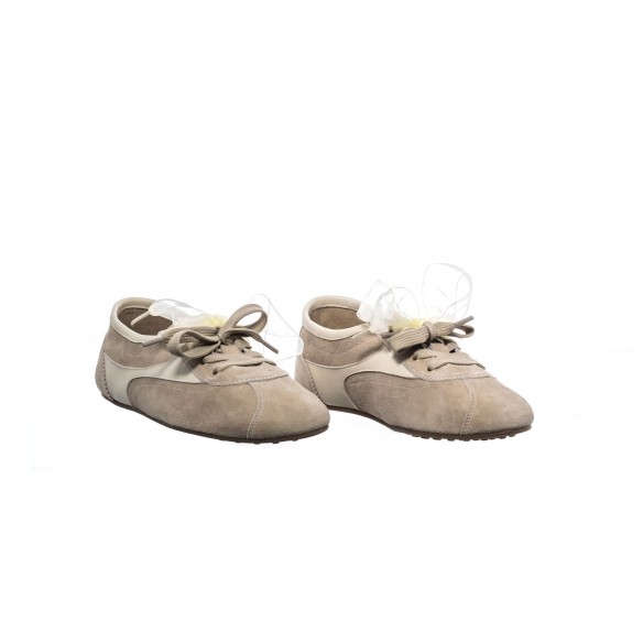 Sneaker en ante y piel beige arena con cordones anchos y lazo en organza. Ligera, flexible y sofisticada. Un diseño natural y luminoso para la primavera.