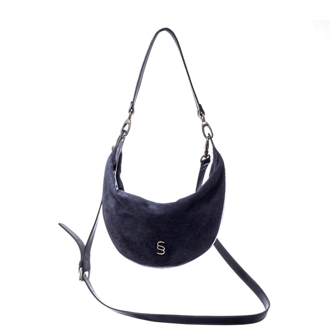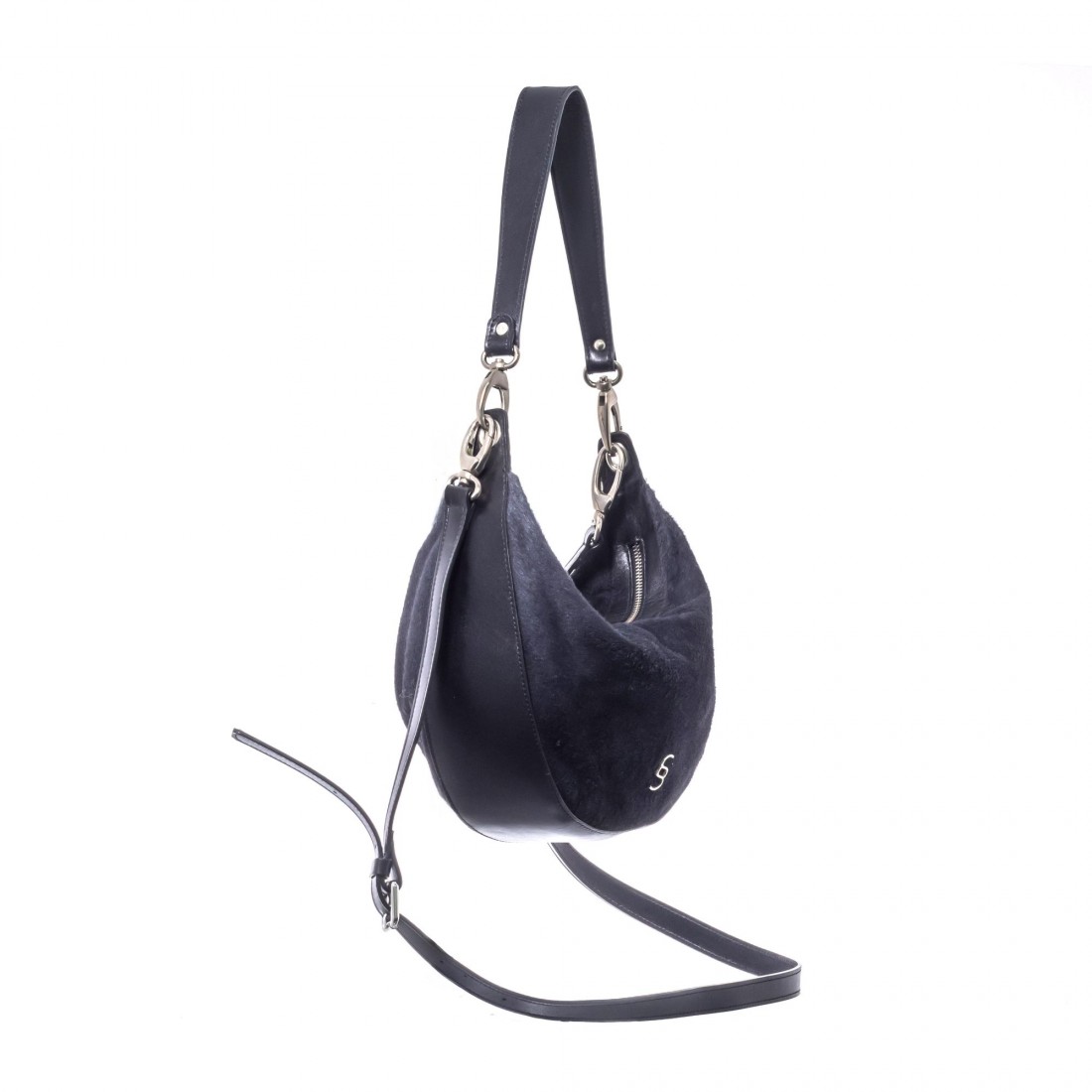 Bolso de silueta curva en piel de poni grafito, suave y con carácter. Doble asa adaptable y detalle metálico Sommits. Un diseño versátil para diario. Medidas: 34 × 20 × 8 cm.