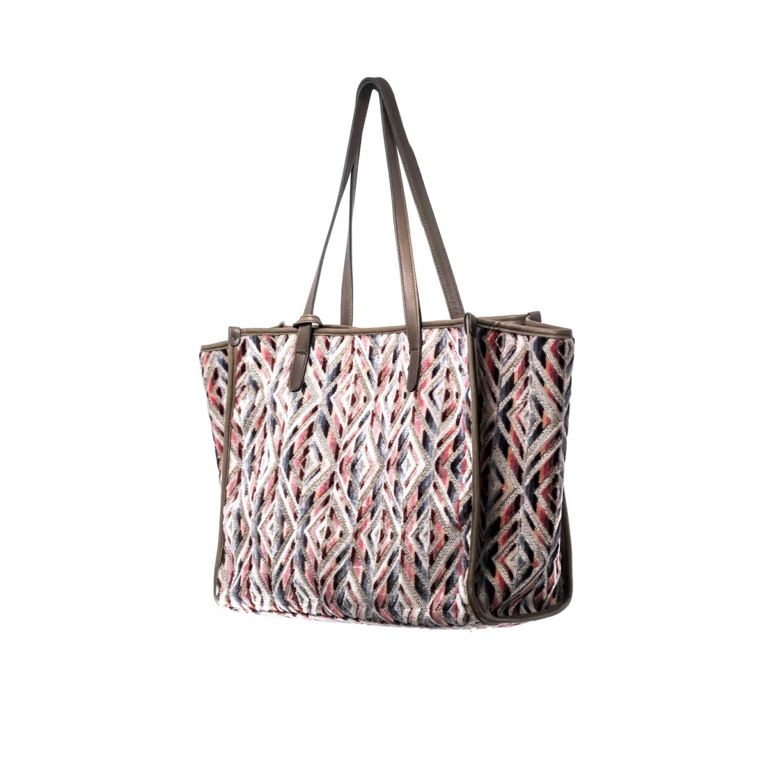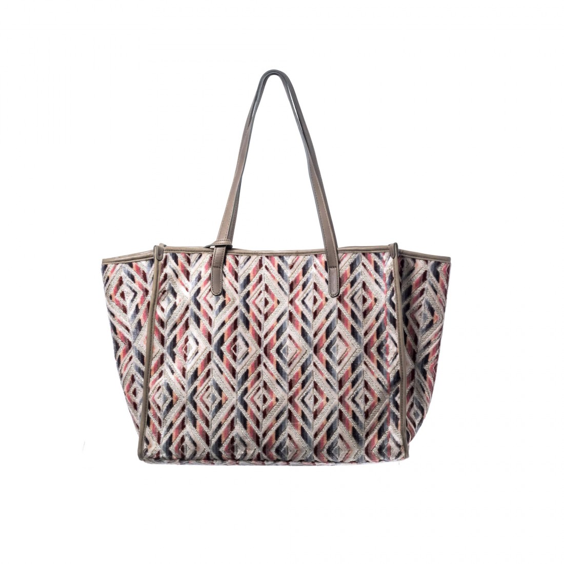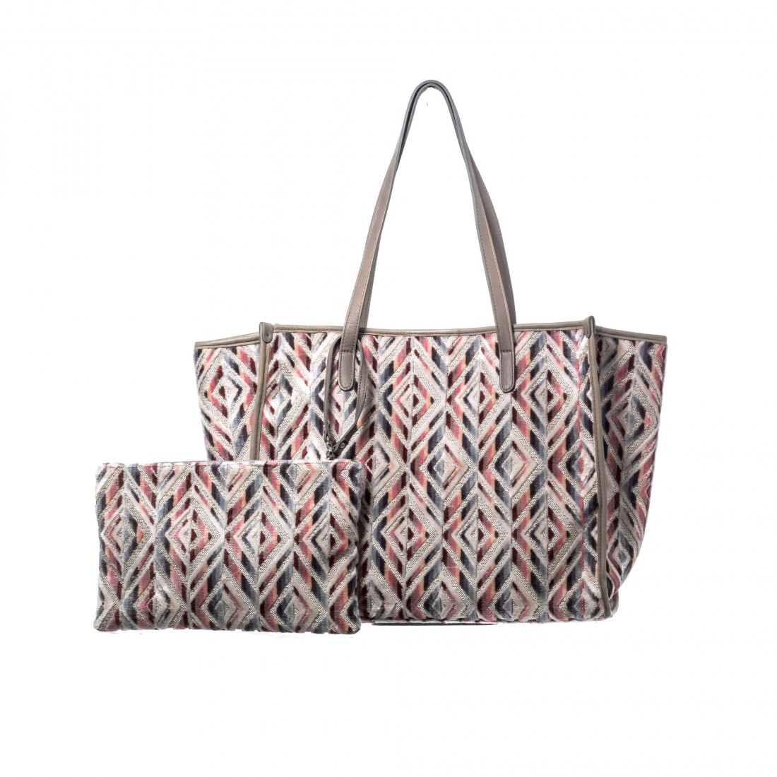 Shopper amplio en tejido geométrico rosa empolvado con detalles en piel taupe. Ligero, resistente y perfecto para el día a día. Incluye pouch interior a juego. Medidas: 38 × 31 × 14 cm.