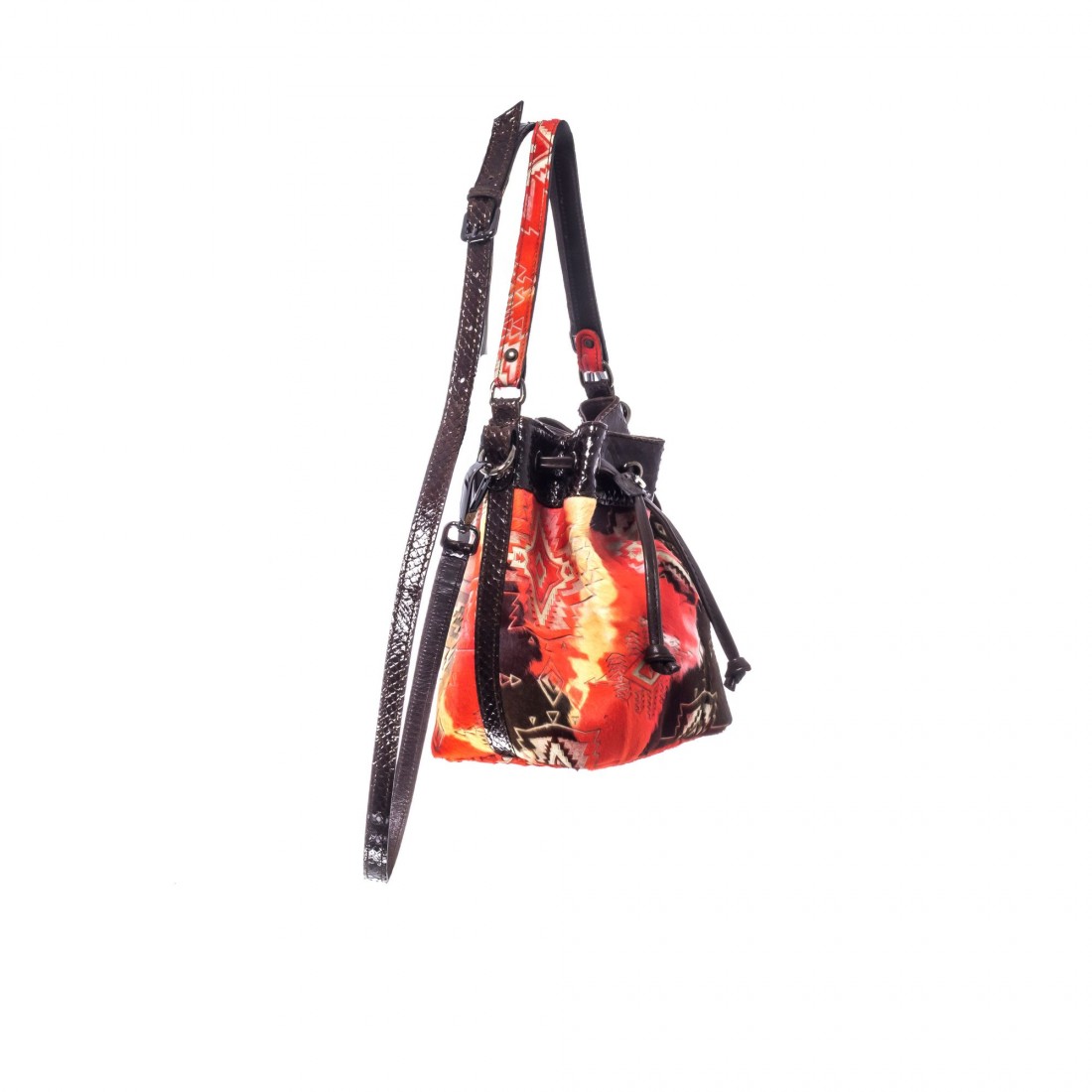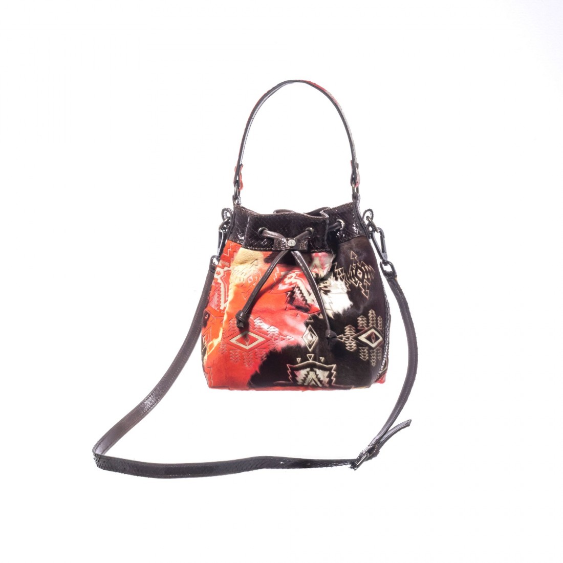 Saco en piel de poni estampada ikat tonos fuego, combinado con detalles en pitón T Moro. Ligero, vibrante y con cierre ajustable. Un diseño único y lleno de personalidad. Medidas: 18 × 22 × 12 cm.