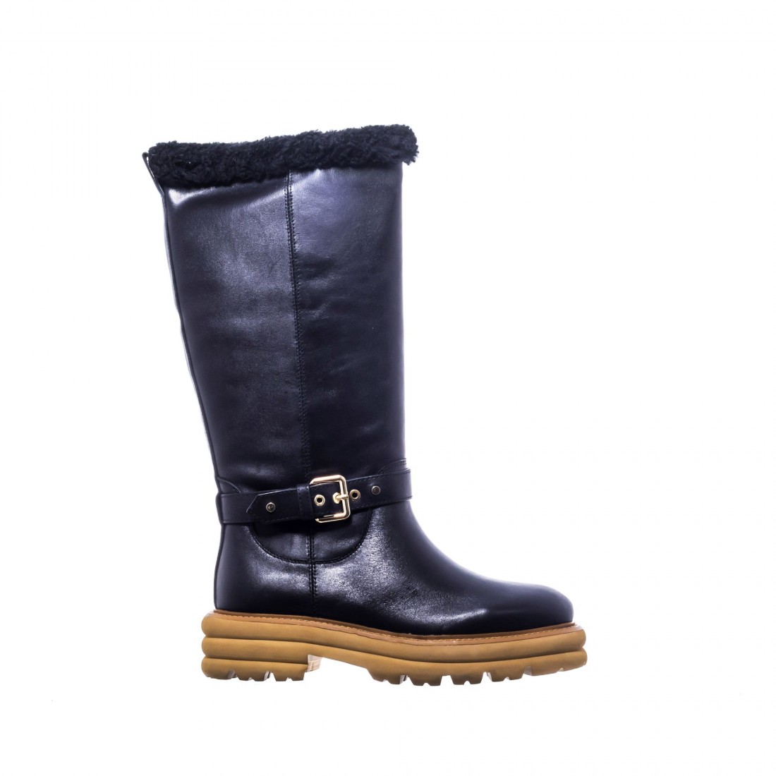 Bota alta en piel negra con borde de borrego y hebilla dorada. Suela de micro ligera y dentada que aporta comodidad y estilo.