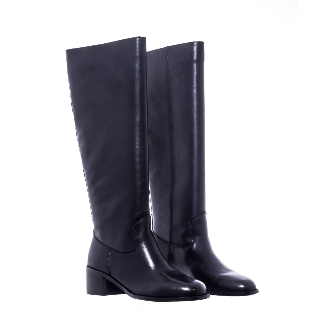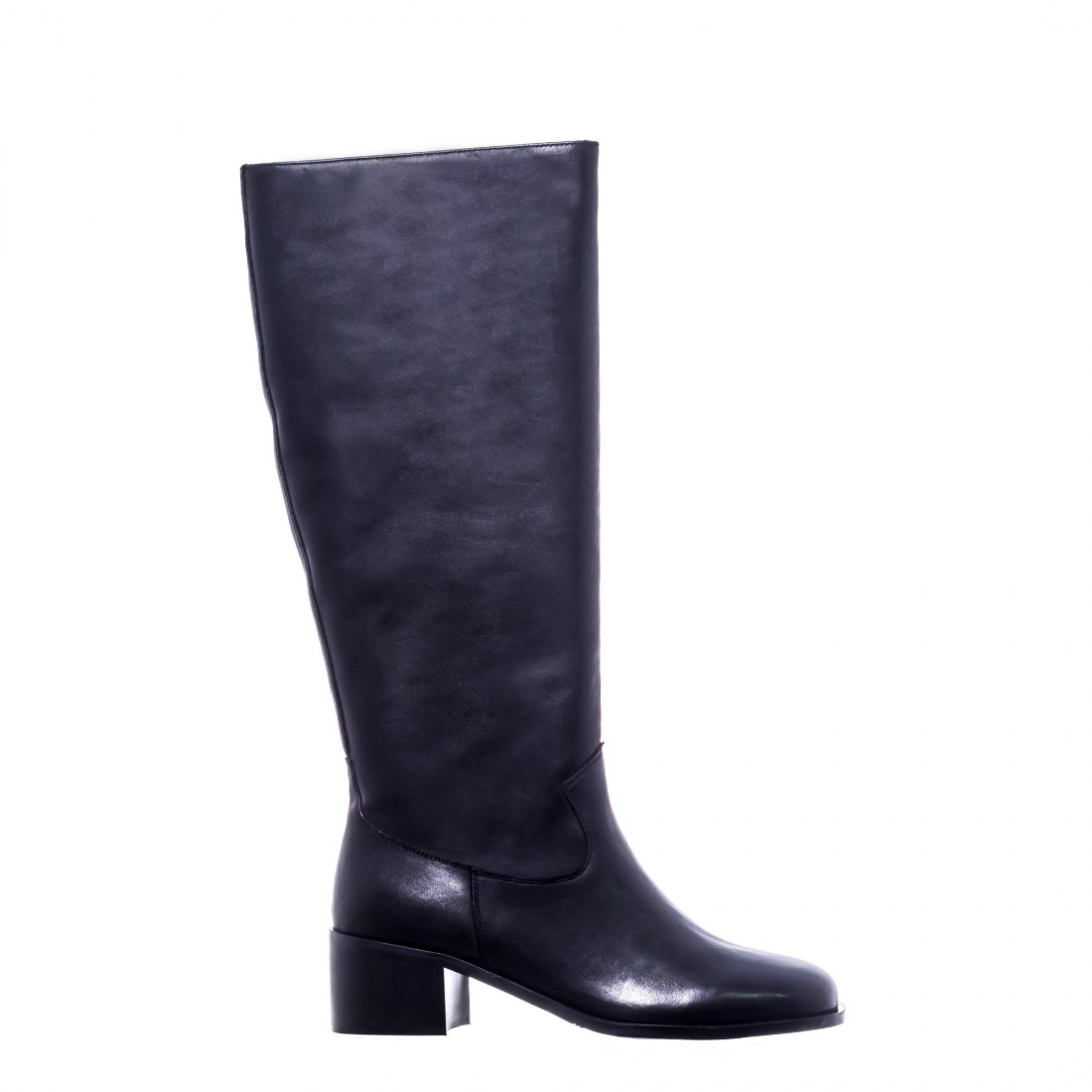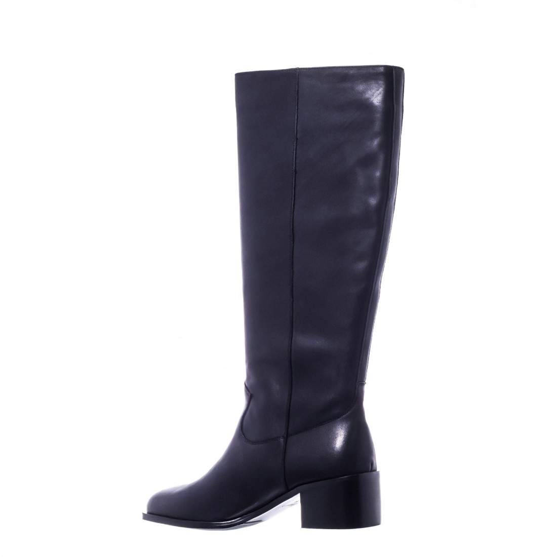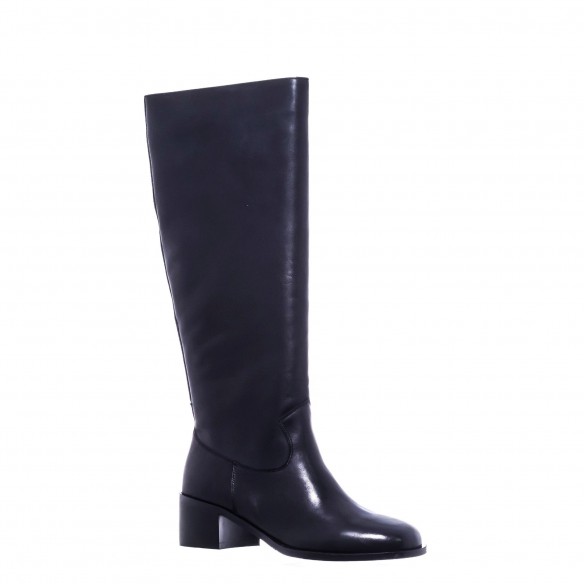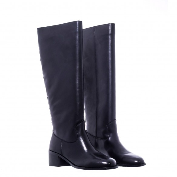 Bota alta en piel negra con tacón ancho de 4 cm. Diseño minimalista y elegante para un estilo atemporal.