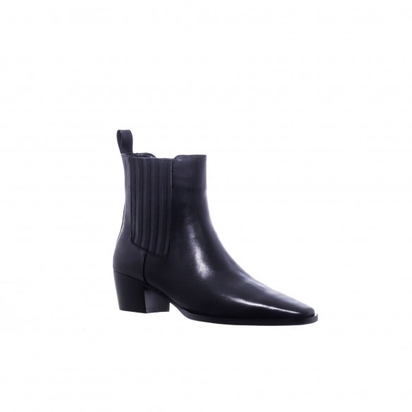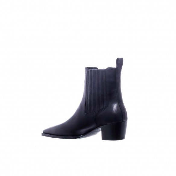 Botín chelsea en piel negra con tacón medio. Diseño atemporal y versátil.