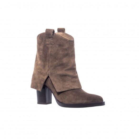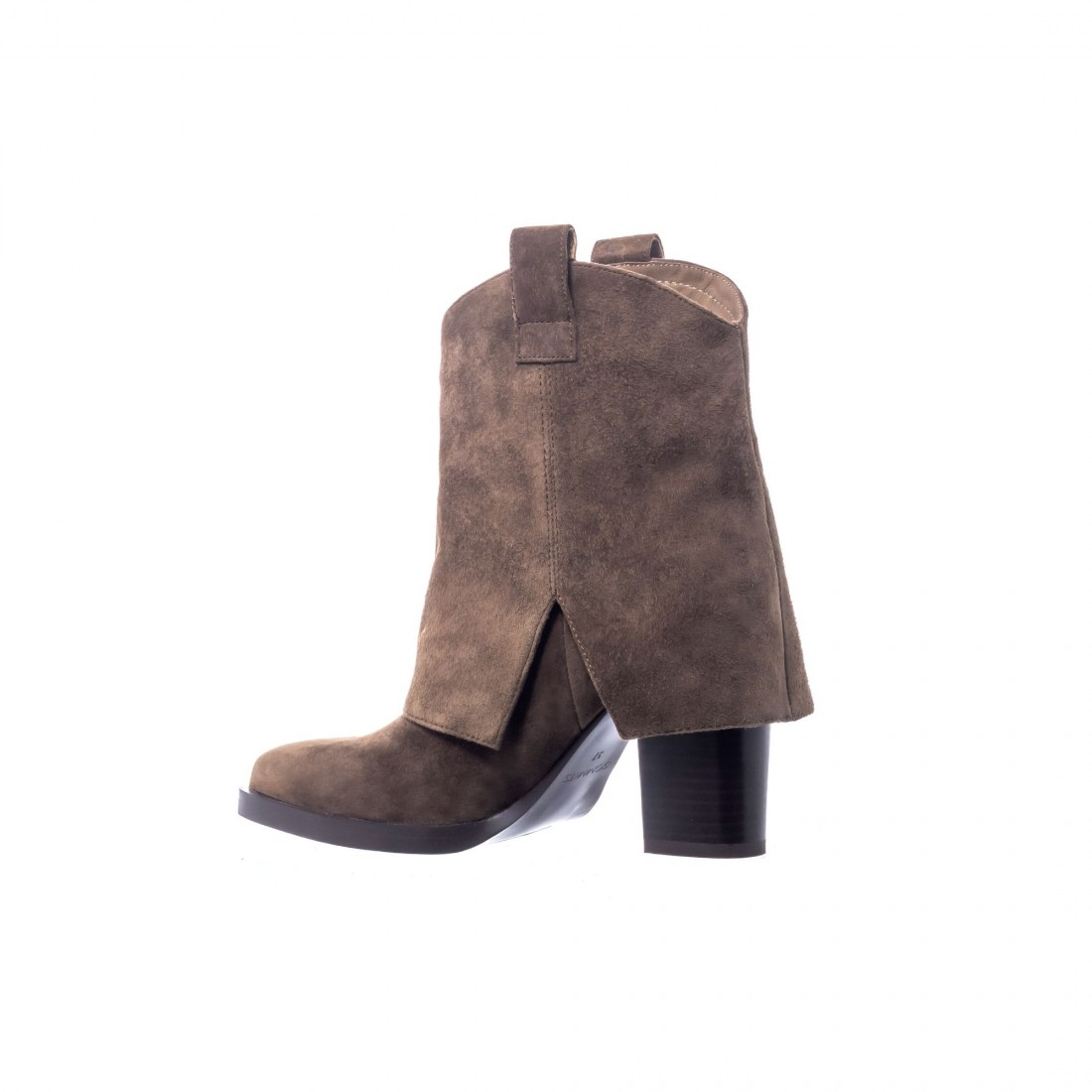 Botín estilo cowboy en ante taupe, con caña superpuesta y tacón de 8 cm. Un diseño elegante y versátil que eleva cualquier look.