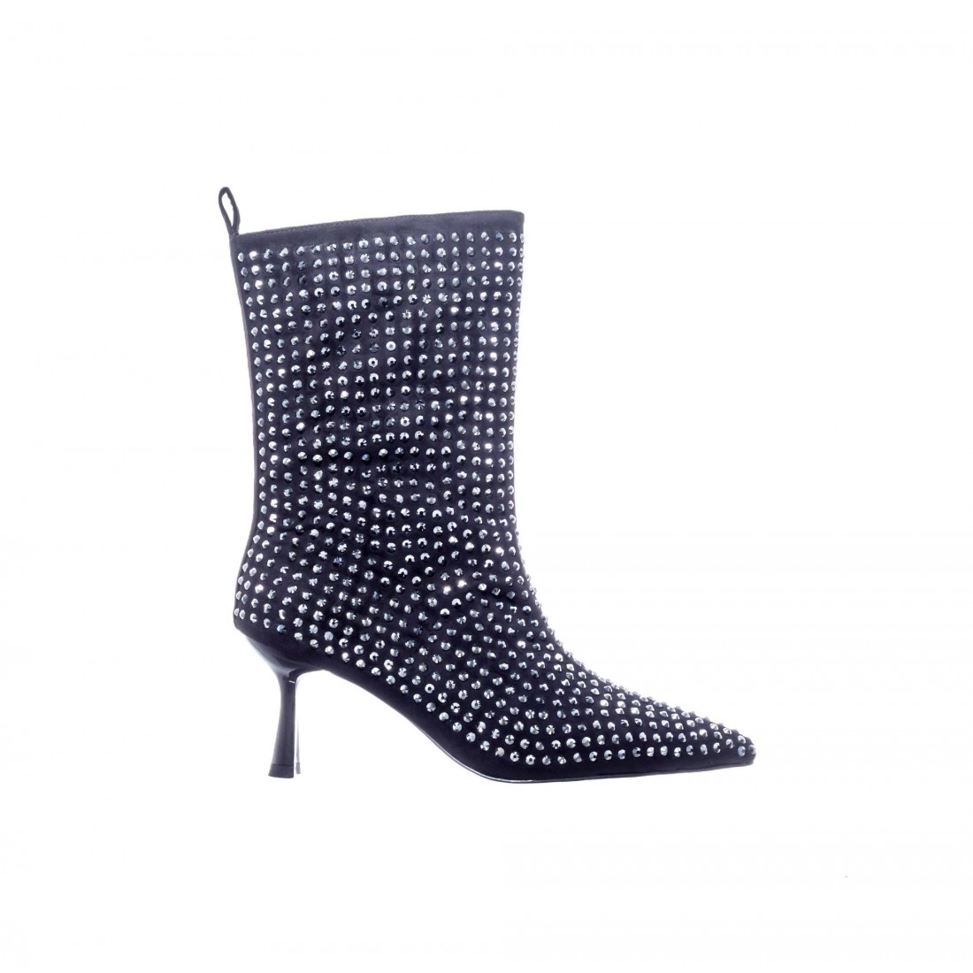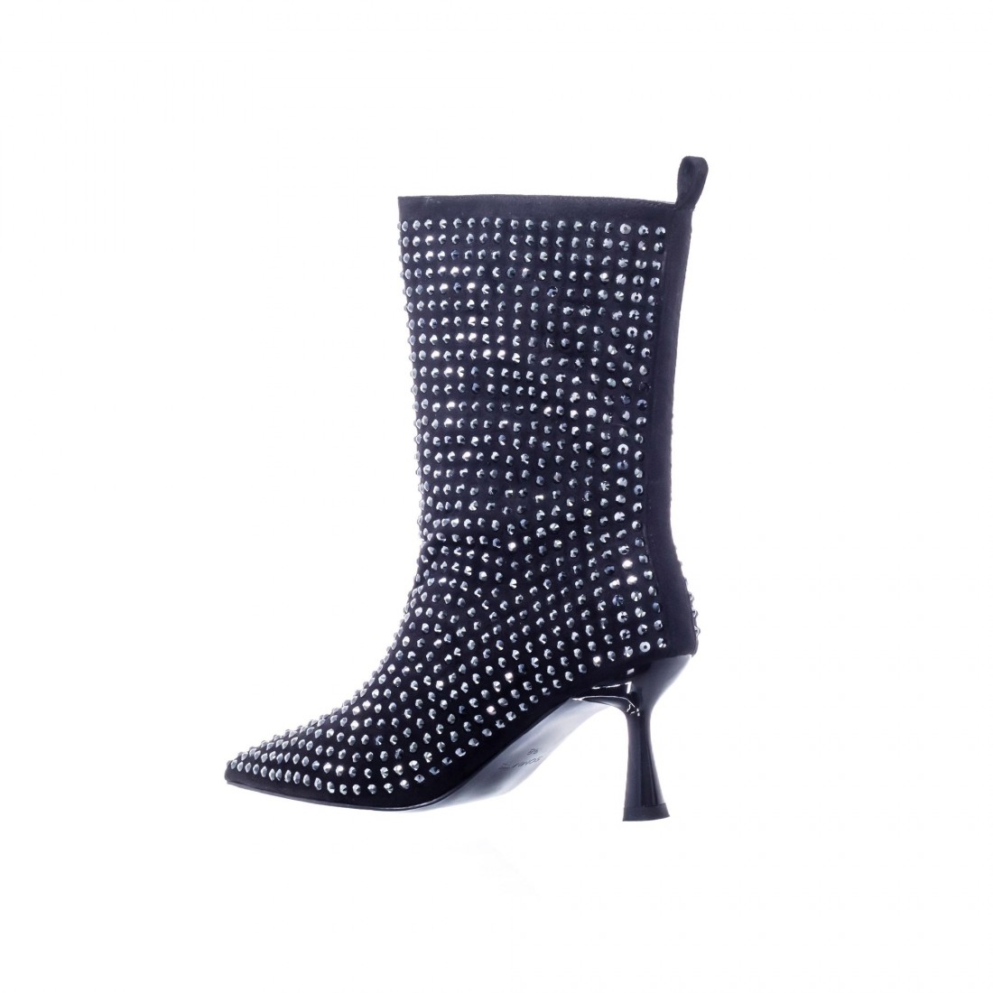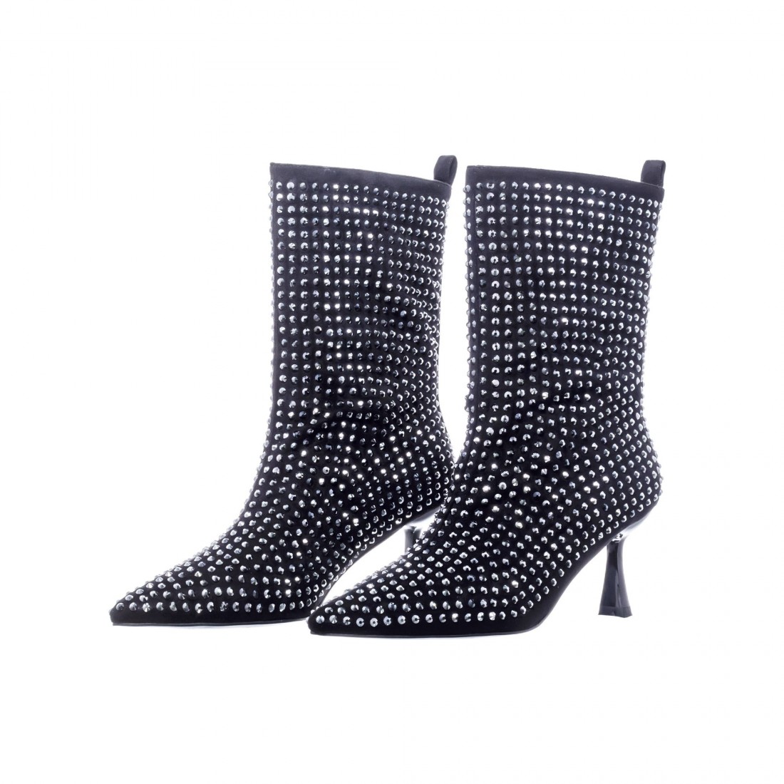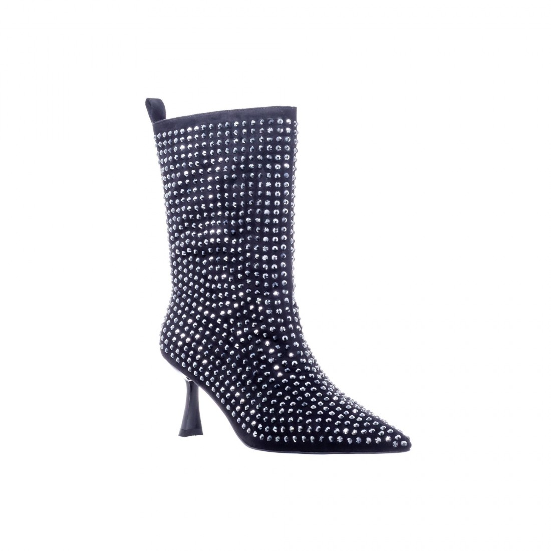 Esta bota está confeccionada en ante negro con incrustaciones de strass, creando un efecto luminoso y envolvente. Su diseño de caña media y punta fina estiliza la pierna, mientras que el tacón fino aporta altura y un toque refinado.