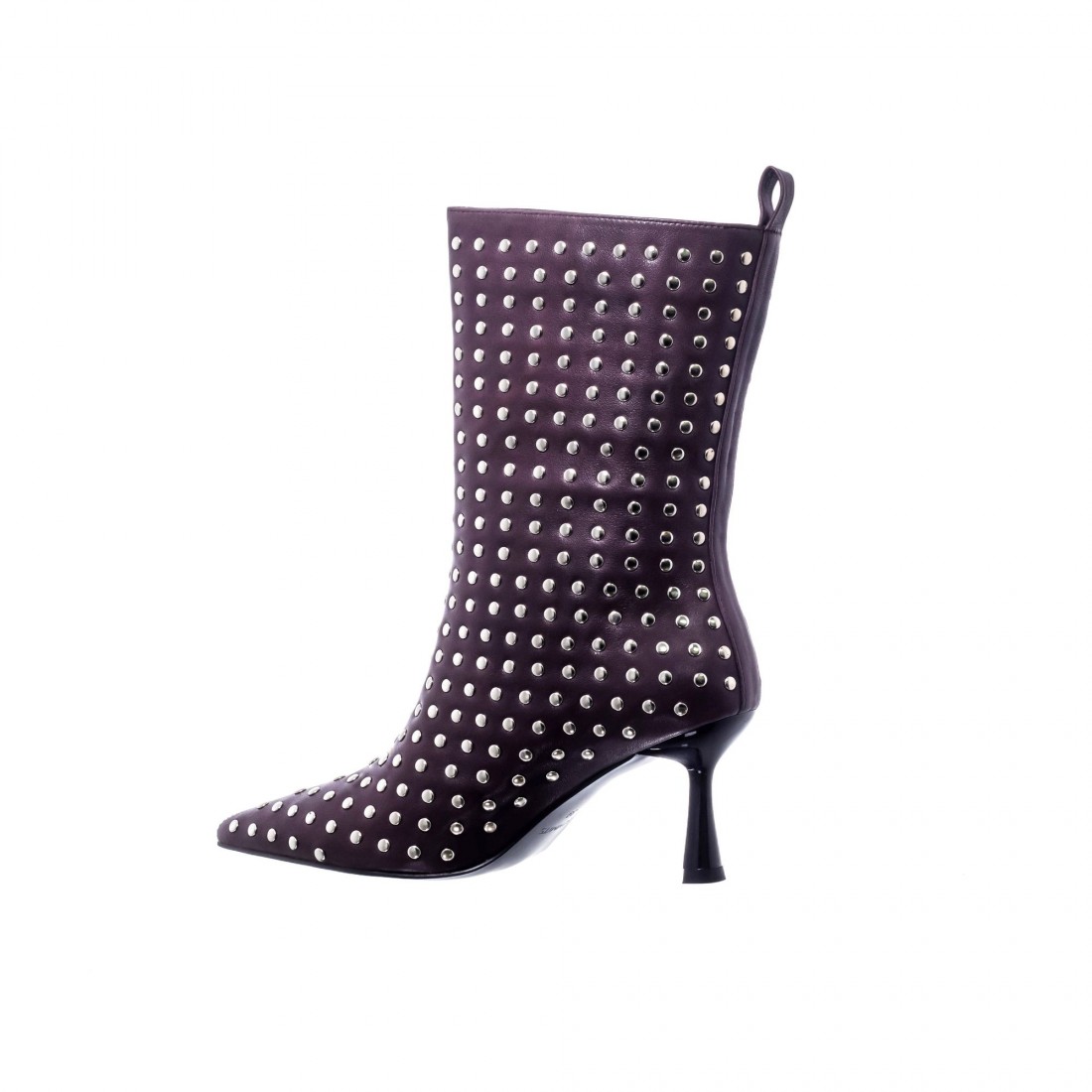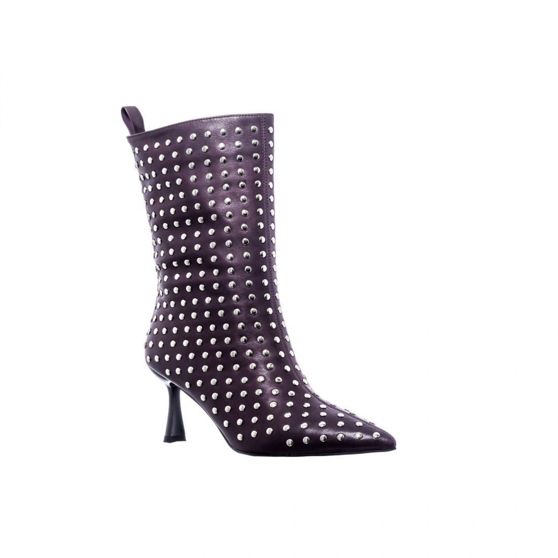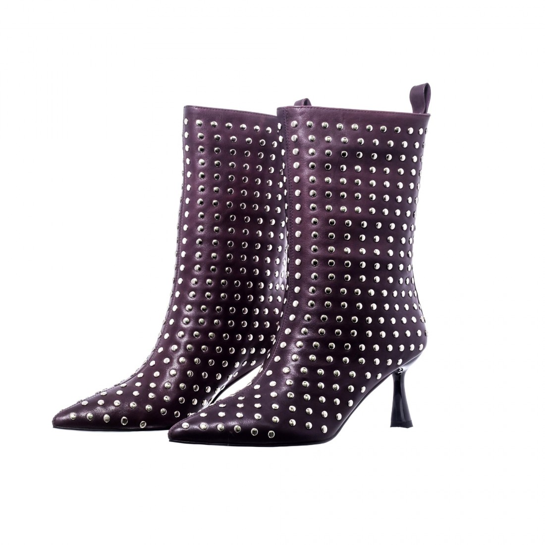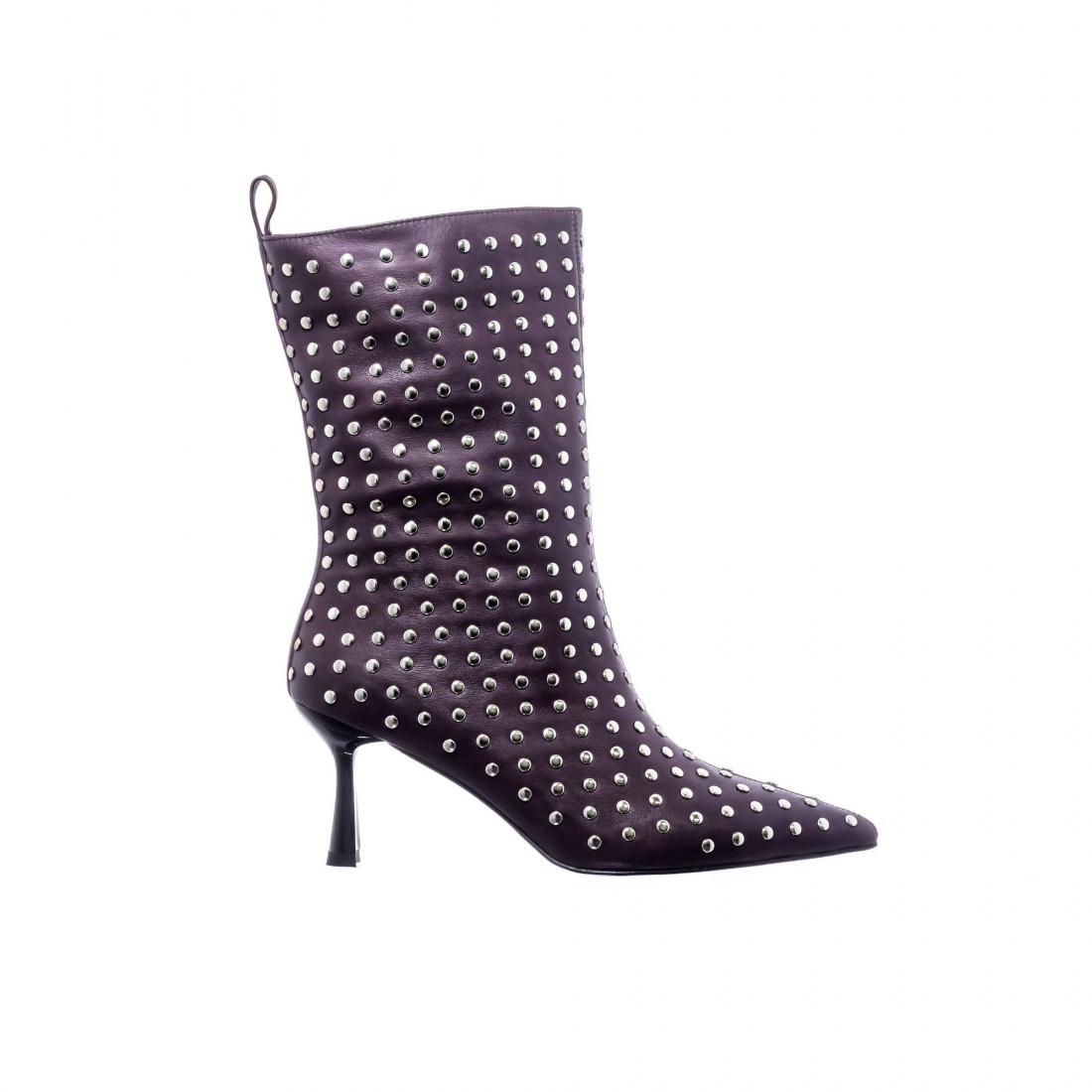 Bota en piel color vino con remaches planos y tacón de 6 cm. Sofisticada y audaz, aporta un toque distintivo a cualquier look.