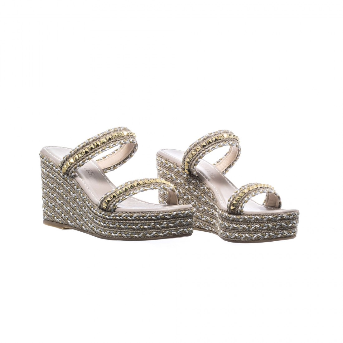 Sandalia de cuña elaborada en trenzado natural con sutiles destellos dorados que aportan textura y luz al diseño. Sus tiras con tachas metálicas enmarcan el empeine con un aire elegante y actual, creando un equilibrio perfecto entre naturalidad y sofisticación.