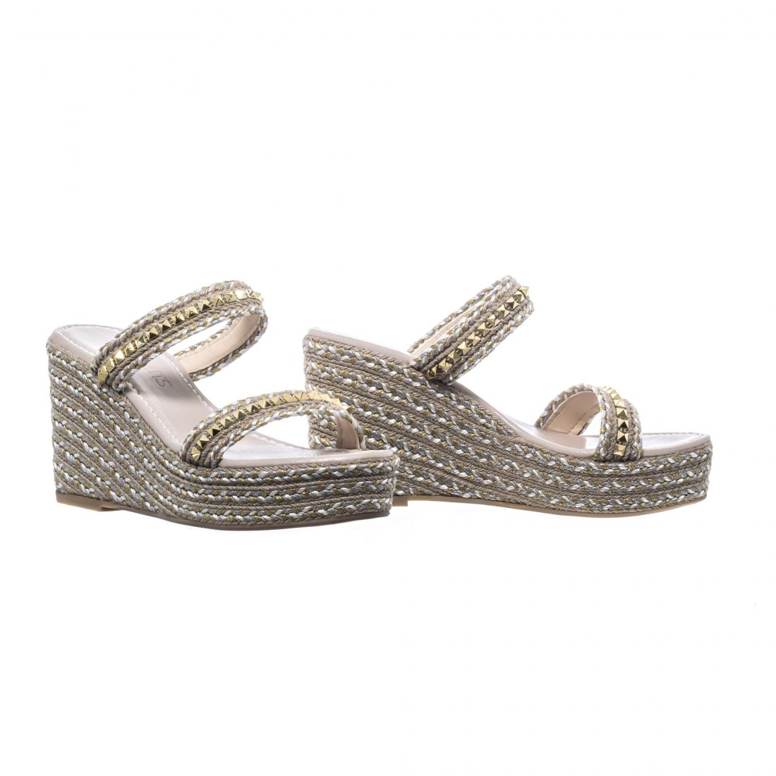 Sandalia de cuña en trenzado natural con destellos dorados y tiras con tachas. Femenina, ligera y cómoda, perfecta para estilizar el look diario con un toque luminoso y sofisticado.