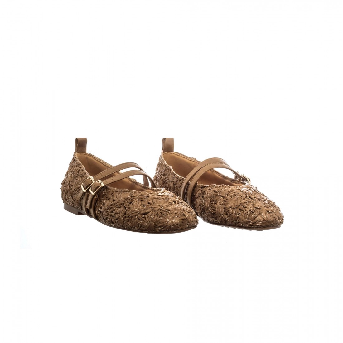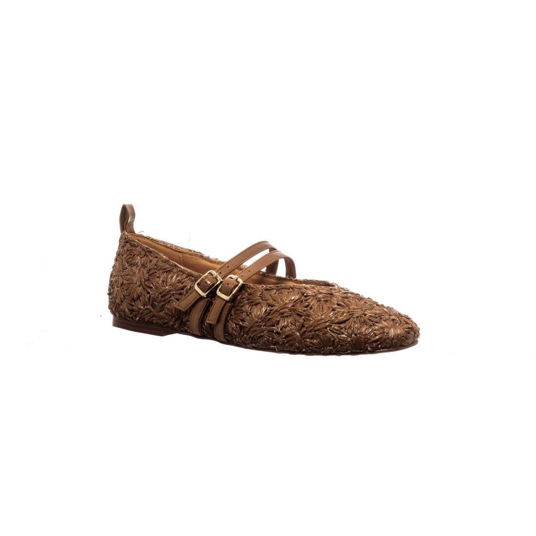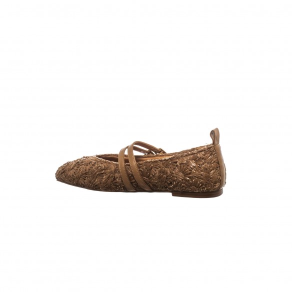 Bailarina de rafia trenzada en tono cuero con doble pulsera y hebillas doradas. Textura artesanal, forro suave y piso flexible. Ligera y sofisticada para una primavera natural y elegante.