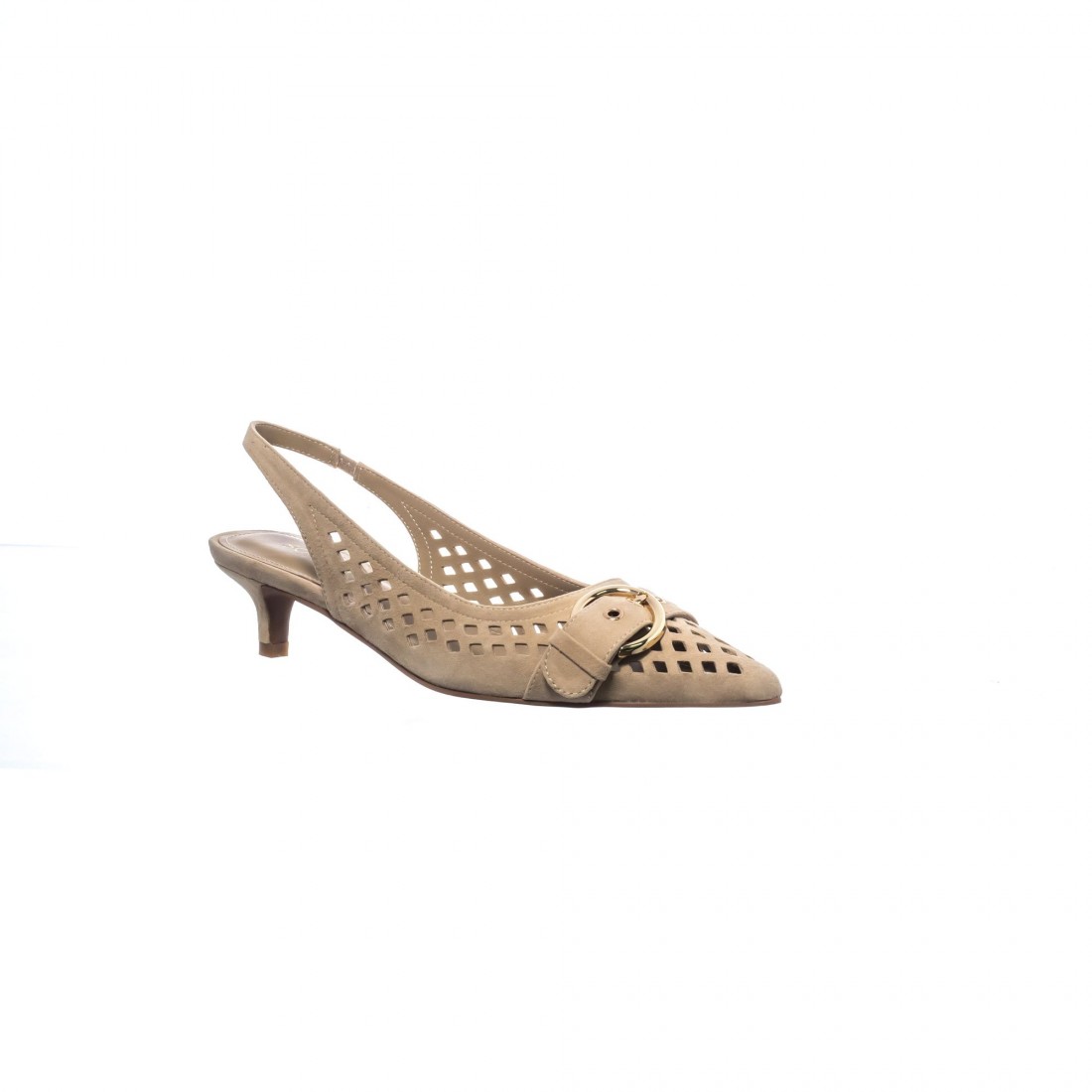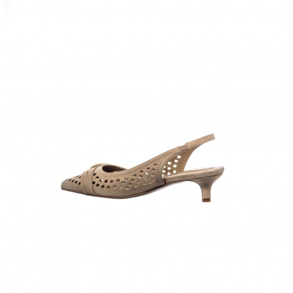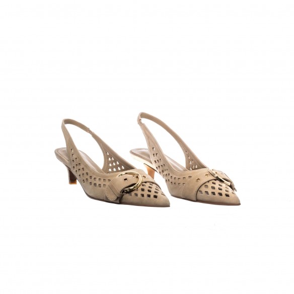 Slingback en ante beige claro con calado geométrico y maxi hebilla dorada. Tacón medio estilizado para un equilibrio perfecto entre elegancia y confort.