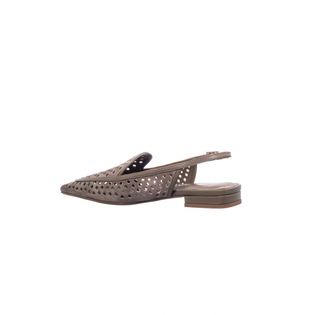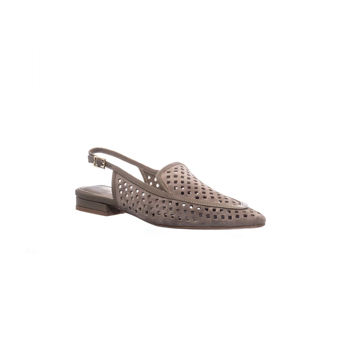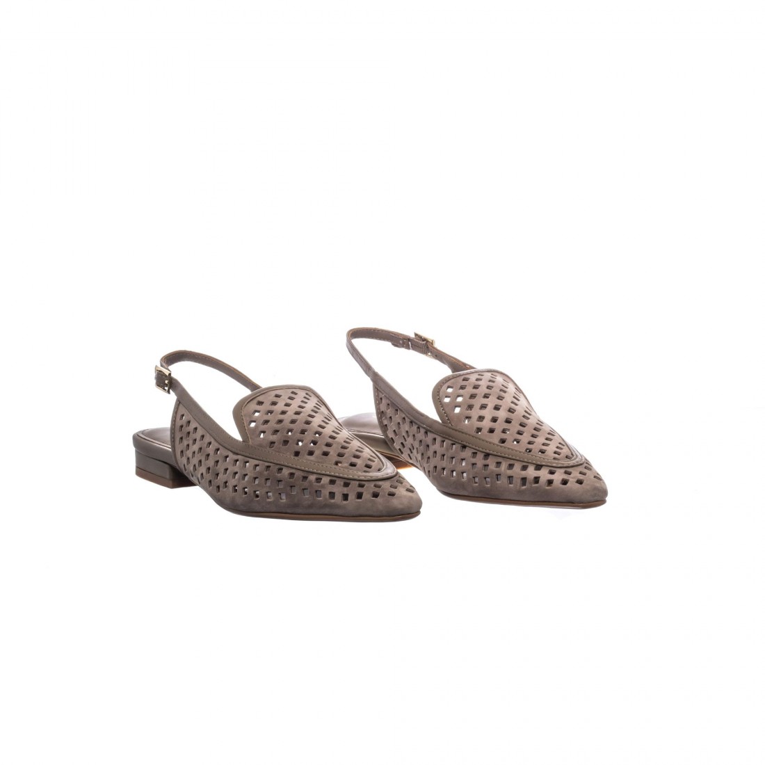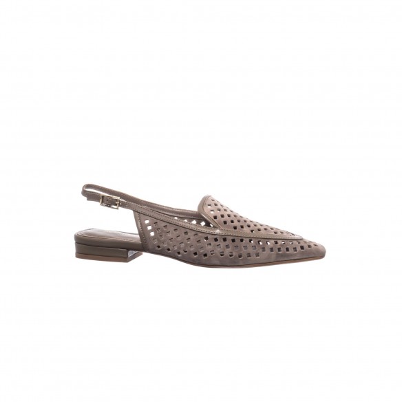 Slingback en ante tono topo con calado geométrico y hebilla ajustable. Femenino, ligero y sofisticado. Tacón bajo para un confort elegante y versátil.