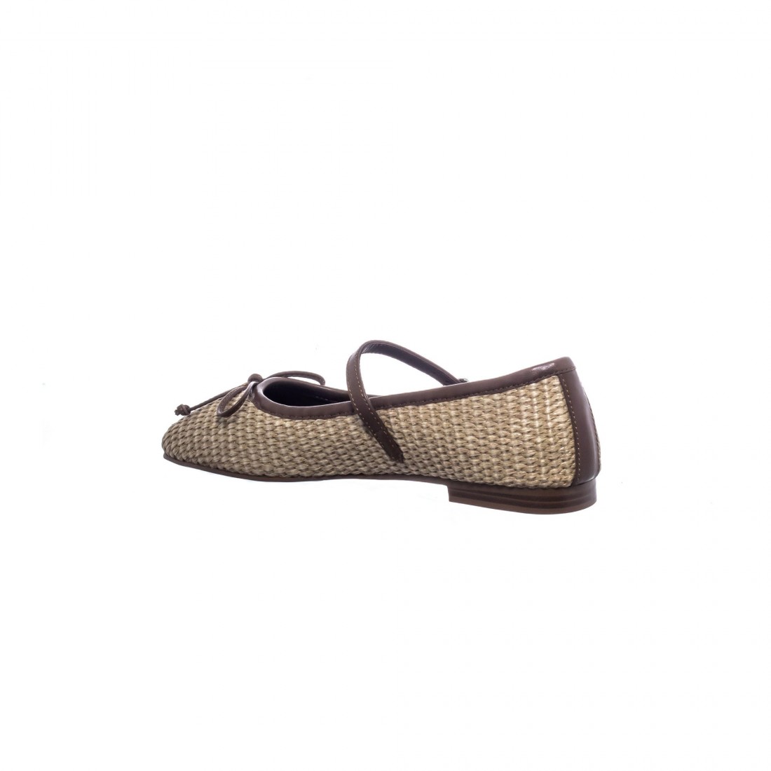 Bailarina de rafia en tono avellana con lazo y pulsera ajustable en piel cuero. Textura artesanal, ligera y flexible. Un diseño cálido y sofisticado para la primavera.