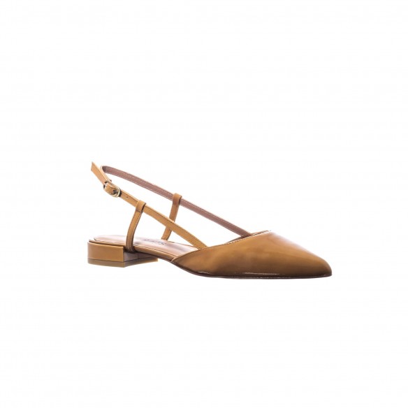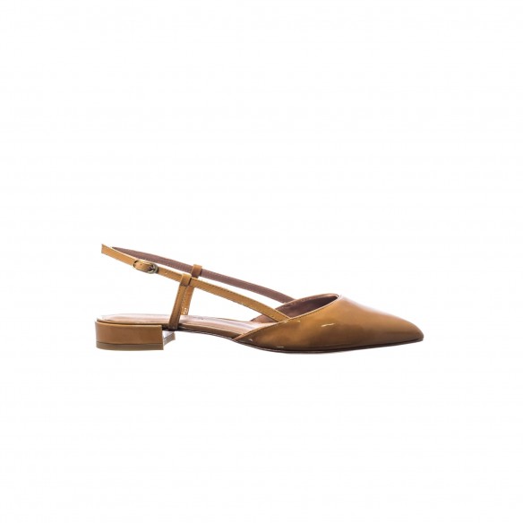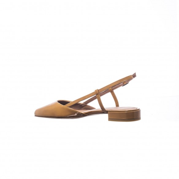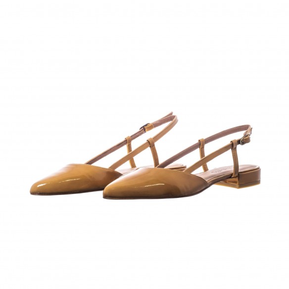 Slingback en charol color ocre. De punta fina y tacón bajo, combina brillo sutil, comodidad y elegancia atemporal.