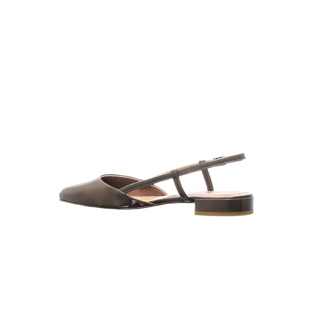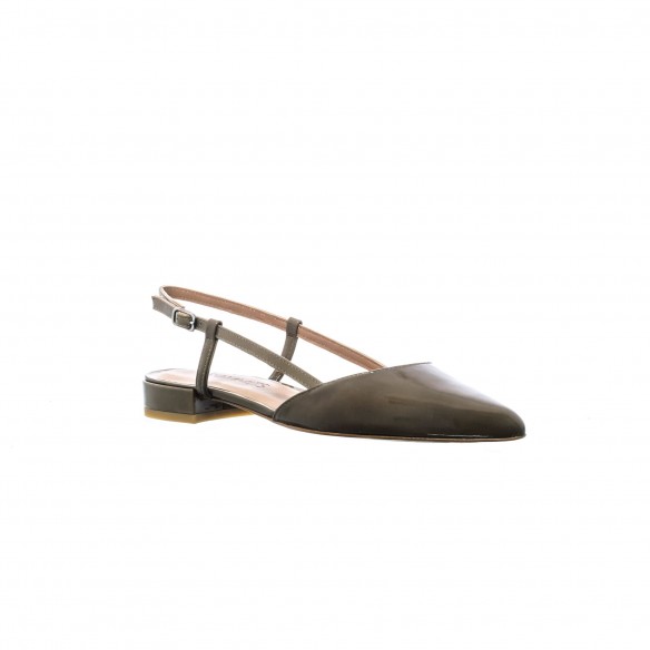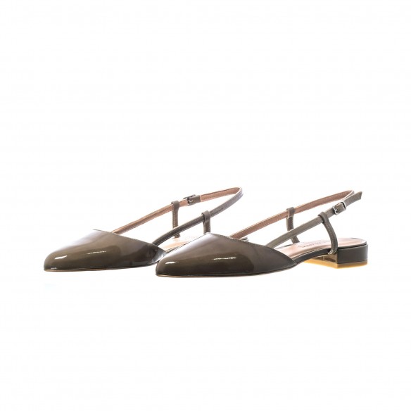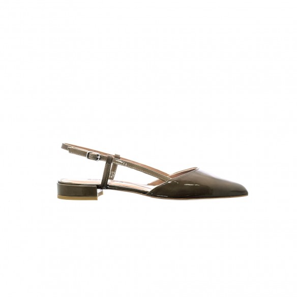Este slingback está confeccionado en charol color verde hoja, con una silueta estilizada de punta fina que alarga el pie y realza la elegancia natural del diseño. Su acabado brillante refleja la luz con sutileza, mientras que el tacón bajo y las finas tiras aseguran comodidad y ligereza.