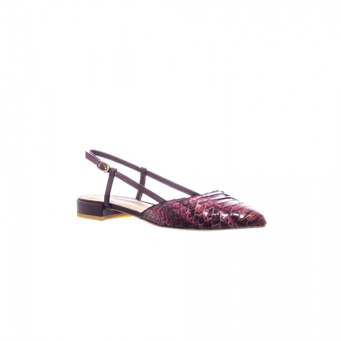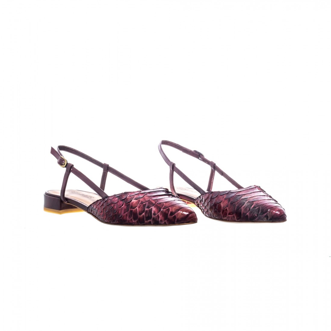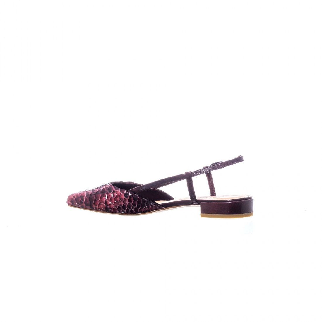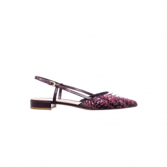 Este zapato plano tipo slingback está confeccionado en piel con de serpiente en tono burdeos intenso, que aporta un toque de elegancia y carácter a cualquier look. Su punta fina estiliza la silueta del pie, mientras que el tacón bajo cuadrado ofrece comodidad durante todo el día.