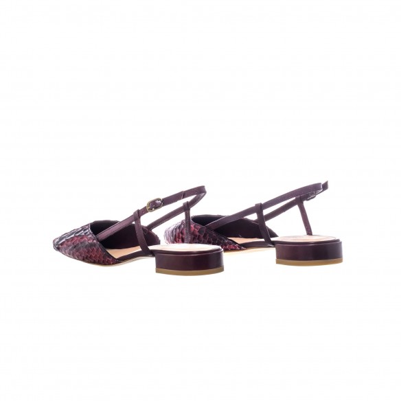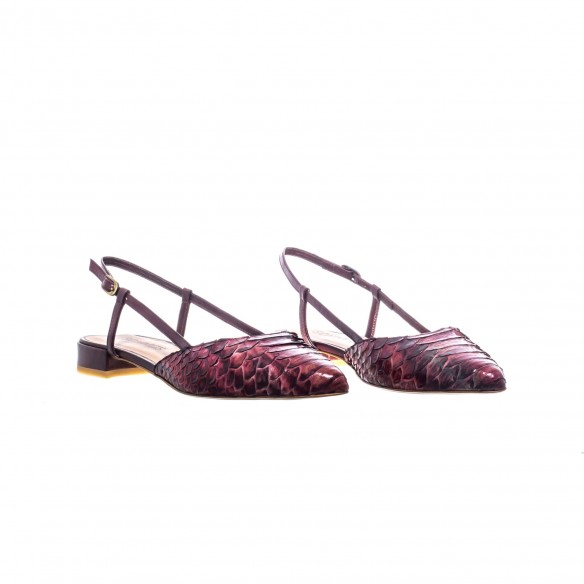 Slingback en piel de serpiente en tonos burdeos. Elegante y versátil, con punta fina y tacón bajo para un estilo sofisticado sin renunciar a la comodidad.