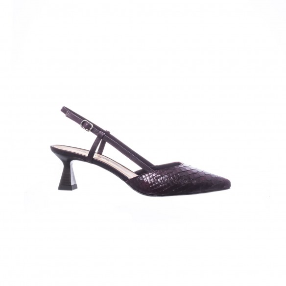 Este slingback está confeccionado en piel auténtica de serpiente en tono burdeos profundo, un color sofisticado que aporta calidez y distinción. Su punta fina realza la silueta del pie, mientras que el tacón medio de forma escultural ofrece una pisada cómoda y femenina.