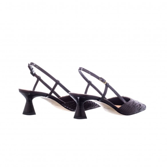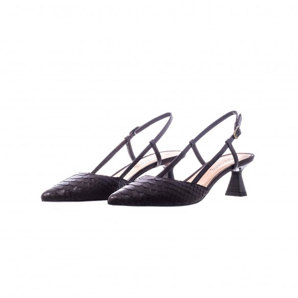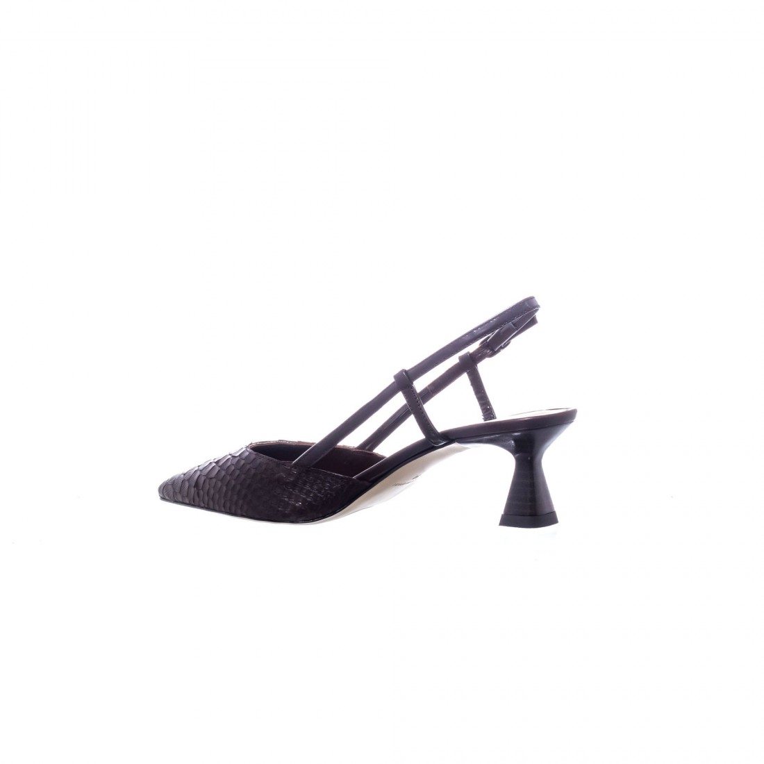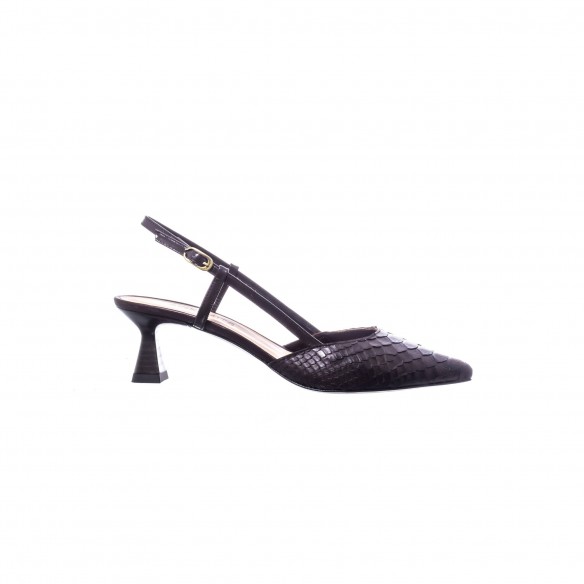 Este slingback está confeccionado en piel auténtica de serpiente en un tono marrón cálido, que resalta la textura y el brillo únicos de este material. Su punta fina estiliza la silueta del pie, mientras que el tacón medio de forma escultural aporta altura, equilibrio y un aire contemporáneo.
