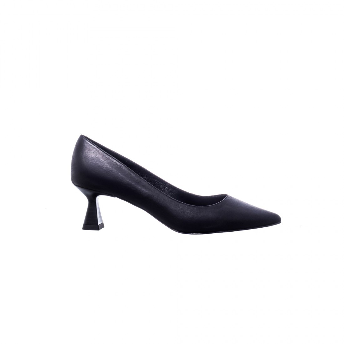 Salón en piel de becerro color negro. De punta fina y tacón medio, combina elegancia atemporal y confort artesanal.