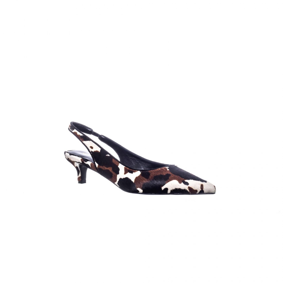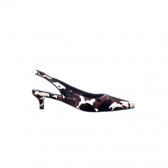 Este slingback está confeccionado en piel con acabado de pelo de vaca, combinando tonos marrón, negro y blanco que hacen de cada par una pieza única. Su diseño de punta fina y tacón bajo ofrece una silueta elegante y atemporal, perfecta para quienes valoran la artesanía y la autenticidad.