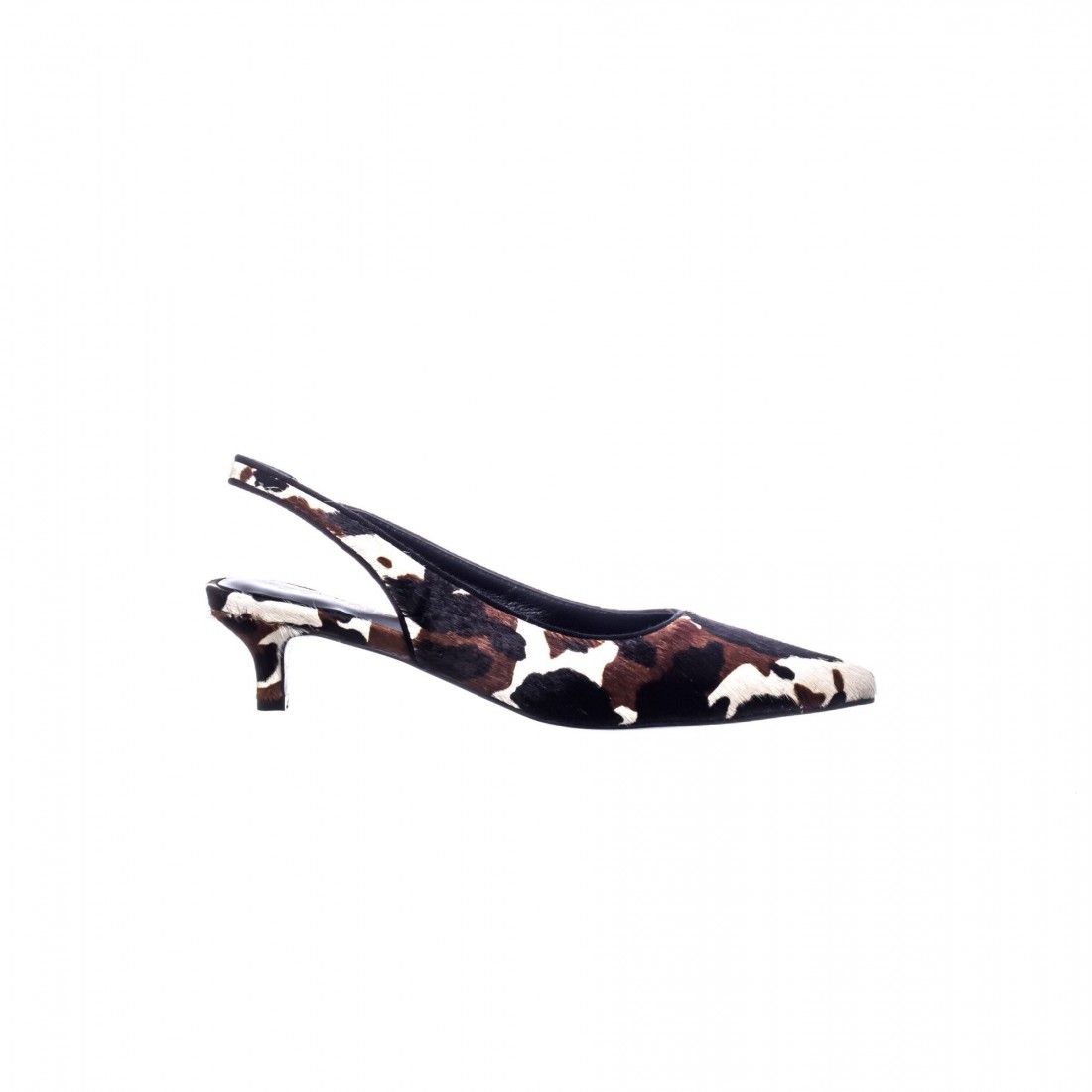 Slingback en piel con pelo de vaca natural. De punta fina y tacón bajo, combina elegancia atemporal con la autenticidad de los materiales naturales.