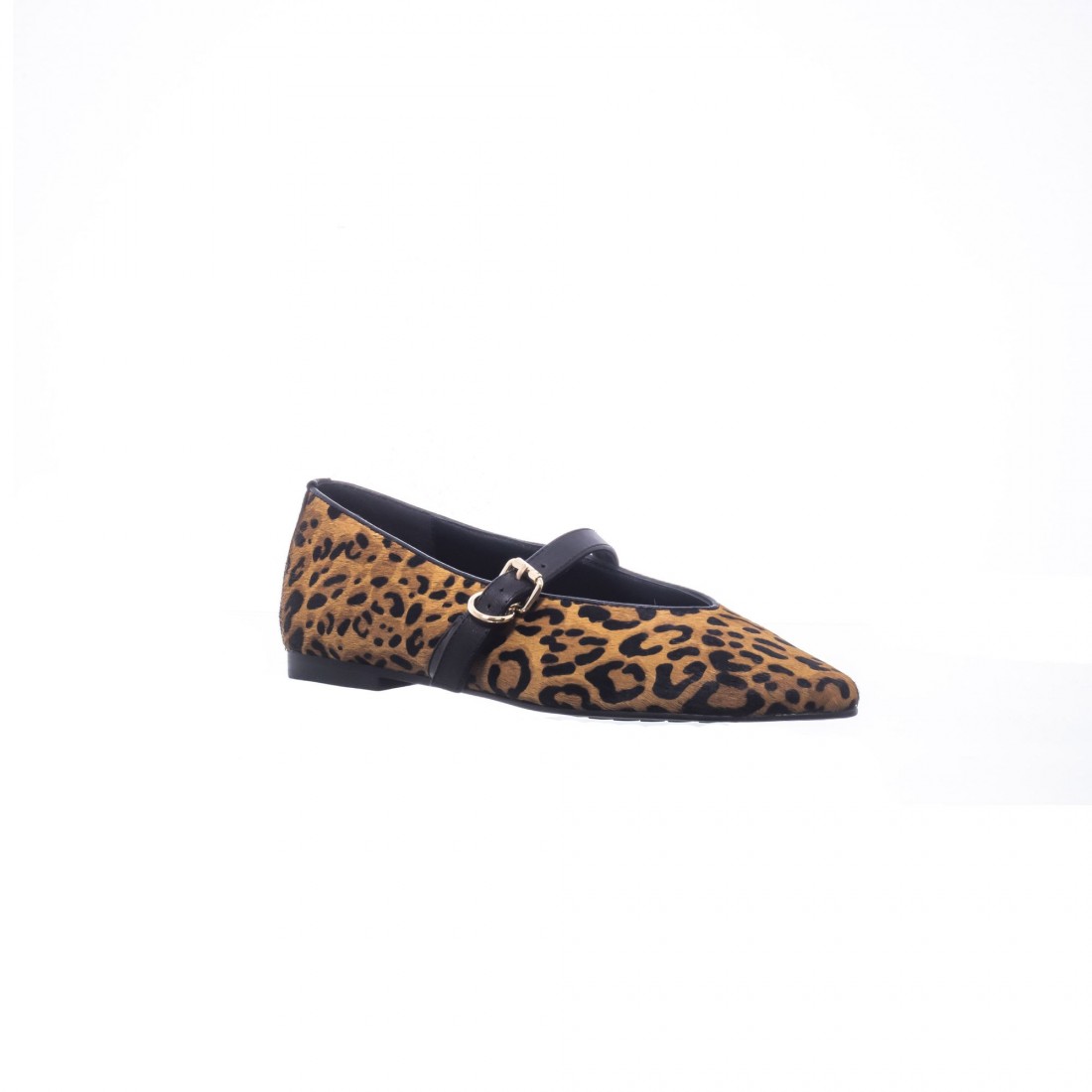 Bailarina en piel con pelo estampado leopardo. De punta fina y con hebilla dorada, combina feminidad y carácter en un diseño cómodo y elegante.