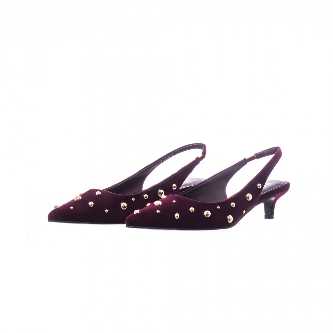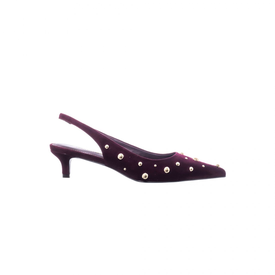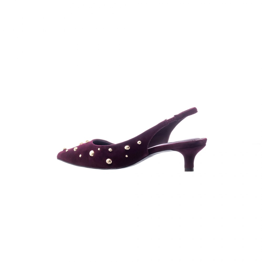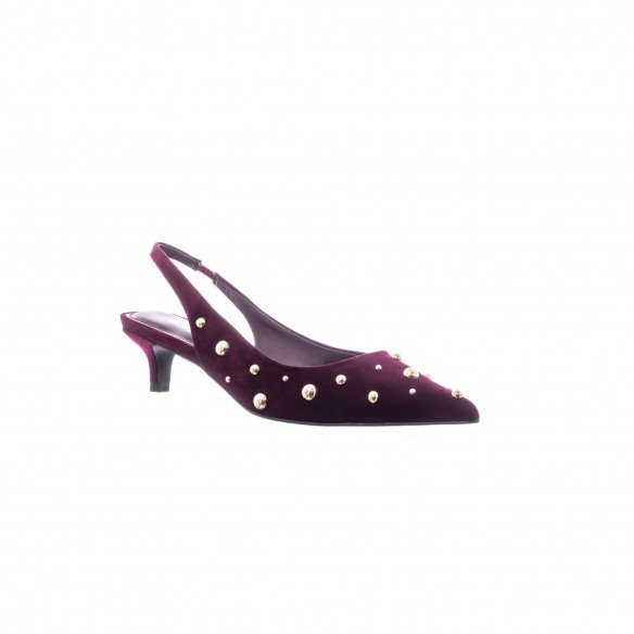 Slingback en ante color vino con remaches de media bola dorados. De punta fina y tacón bajo, combina sofisticación y un brillo elegante.