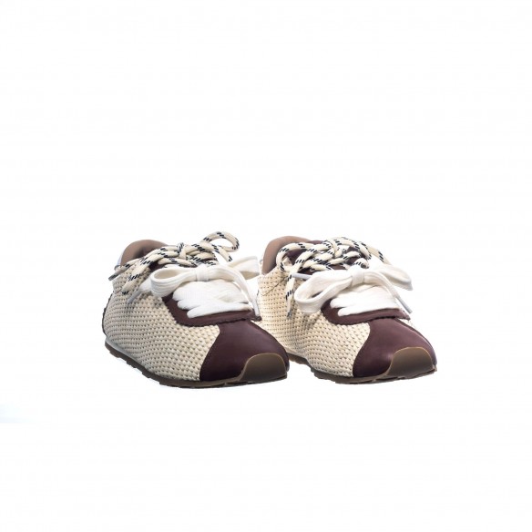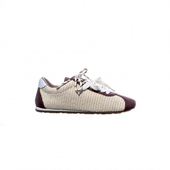 Sneaker en rafia off white con detalles en piel tono marrón y cordones dobles. Fresca, ligera y sofisticada. Estilo mediterráneo con carácter y elegancia.