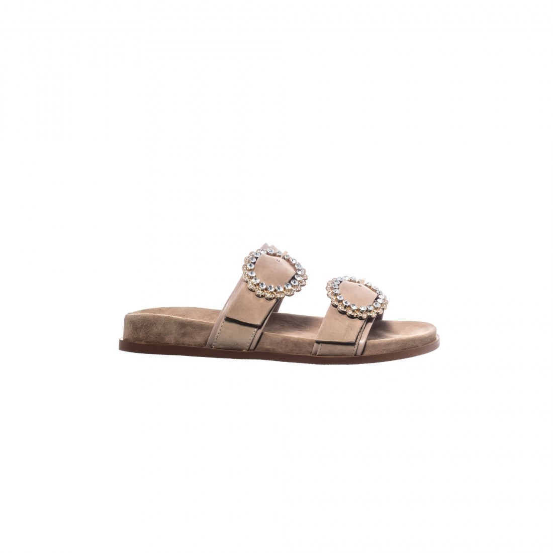 Sandalia plana en piel de ante en tono nude con hebillas joya decoradas con cristales. Un diseño elegante y luminoso que aporta un toque sofisticado a los looks de verano.
