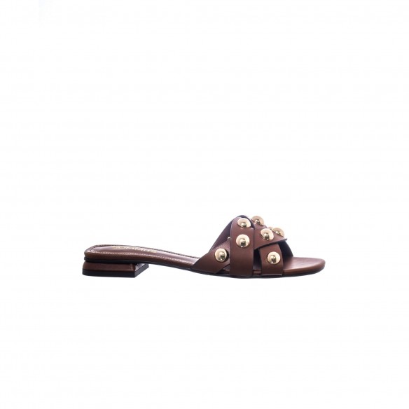 Sandalia plana en piel color cuero con tiras cruzadas y aplicación de maxi tachas doradas. Un diseño elegante con carácter que aporta personalidad a los looks de verano sin renunciar a la comodidad.