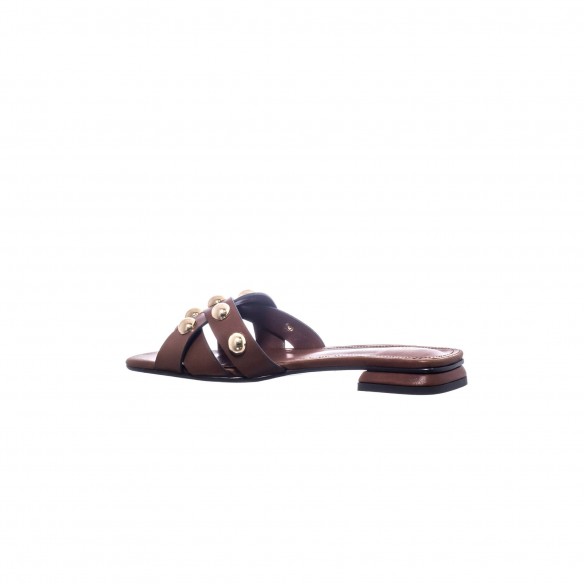 Sandalia plana confeccionada en piel en tono cuero, con tiras cruzadas decoradas con maxi tachas metálicas en acabado dorado que aportan un aire sofisticado y actual. El contraste entre la piel natural y el brillo sutil de las piezas metálicas crea un diseño con personalidad, elegante y contemporáneo.