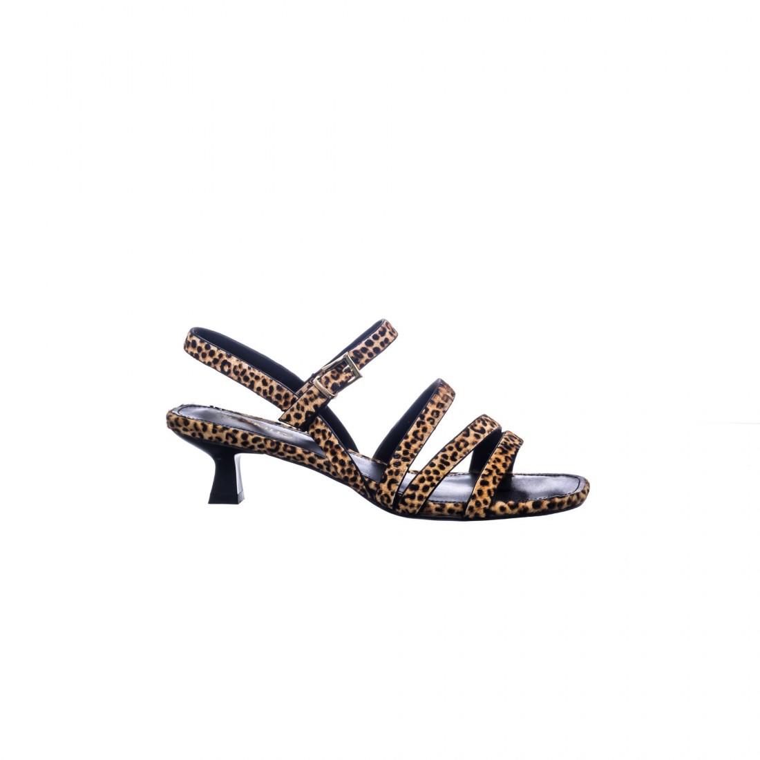 Sandalia de tacón medio en piel con estampado leopardo y finas tiras. Un diseño femenino que combina carácter y elegancia, ideal para aportar un toque sofisticado y actual a los looks de verano.