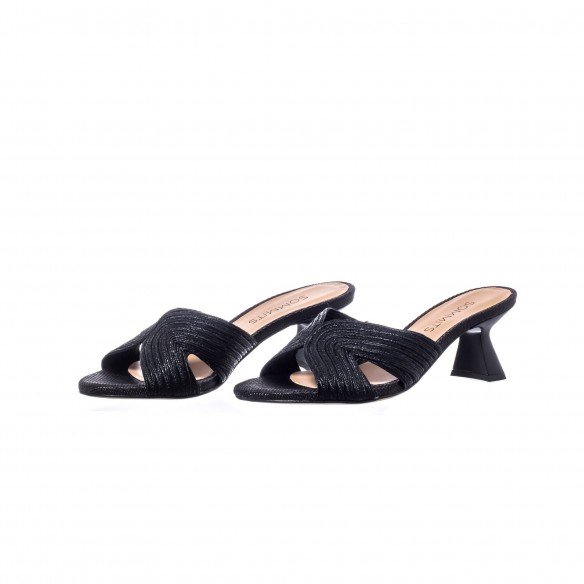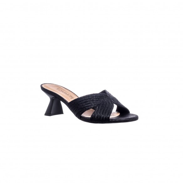 El acabado en rafia bordada aporta textura y profundidad, mientras el negro añade un toque sofisticado y elegante que se adapta a cualquier ocasión. El tacón de 5,5 cm ofrece una altura cómoda y equilibrada, ideal para llevarla durante horas.