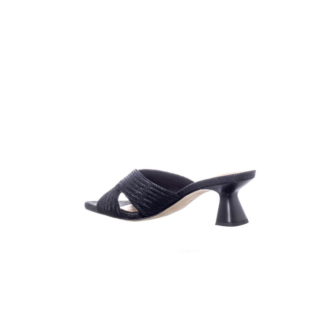 Sandalia en bordado de rafia color negro con diseño cruzado y tacón de 5,5 cm. Sofisticada y versátil, es el básico elegante perfecto para elevar cualquier look de día o de noche.
